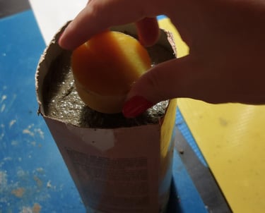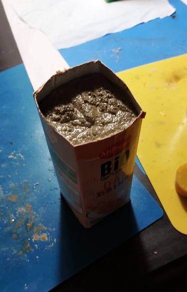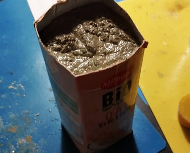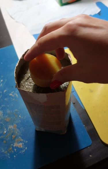 Žvakidžių kūrimas: pakuotes naudoju kaip formas — pripildau betono mišiniu.