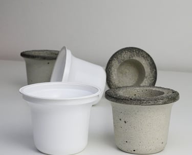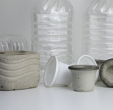 Betoninių žvakidžių kūryboje dažnai naudoju ir įvairias pakuotes iš savo kasdienybės - nedepozitinius plastiko butelius, jogurto indelius, tetrapakus nuo pieno, kaip formas žvakidėms lieti. Tokiu būdu panaudoju pakuotę dar kartą ir suteikiu pakuotėms antrą gyvenimą.